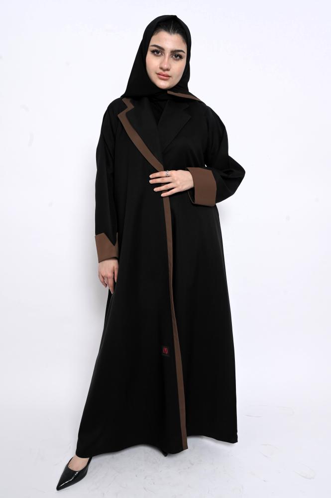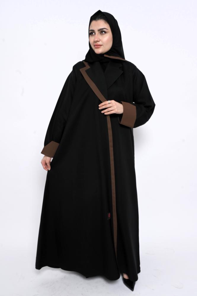 تميزي بعباية كتان أسود بتصميم جاكيت لف ، وقصة نص كلوش بتدخيلة من الكتان البني، مع أكمام كلاسيكية مقلوبة بلون بني، لإطلالة راقية تجمع بين العصرية والفخامة.